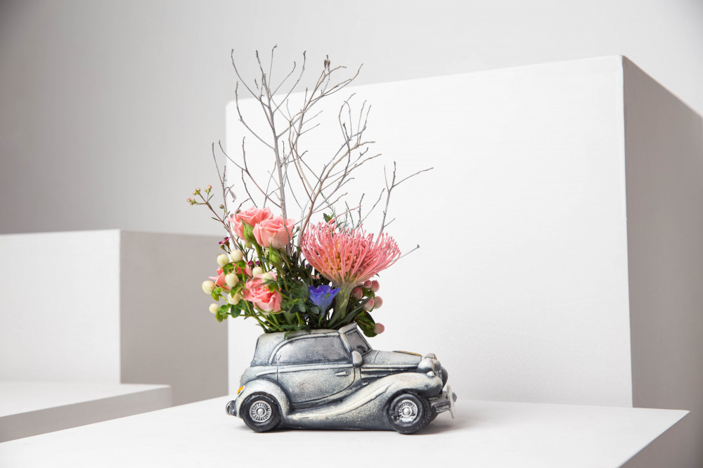 التنسيق مكون من فازة فخارية على شكل سيارة مزينة بالأزهار الوردية ومتوجة بلوحة السيارة ماركة peony.