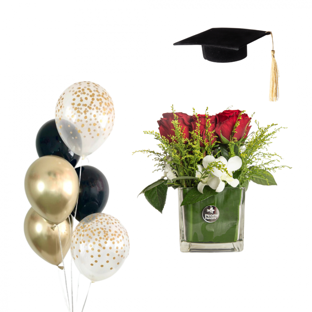 باقة مصممة بتميز تشمل باقة جمال ربيع القلب قبعة تخرج مقاس 20*20 سم و عدد 6 بالون